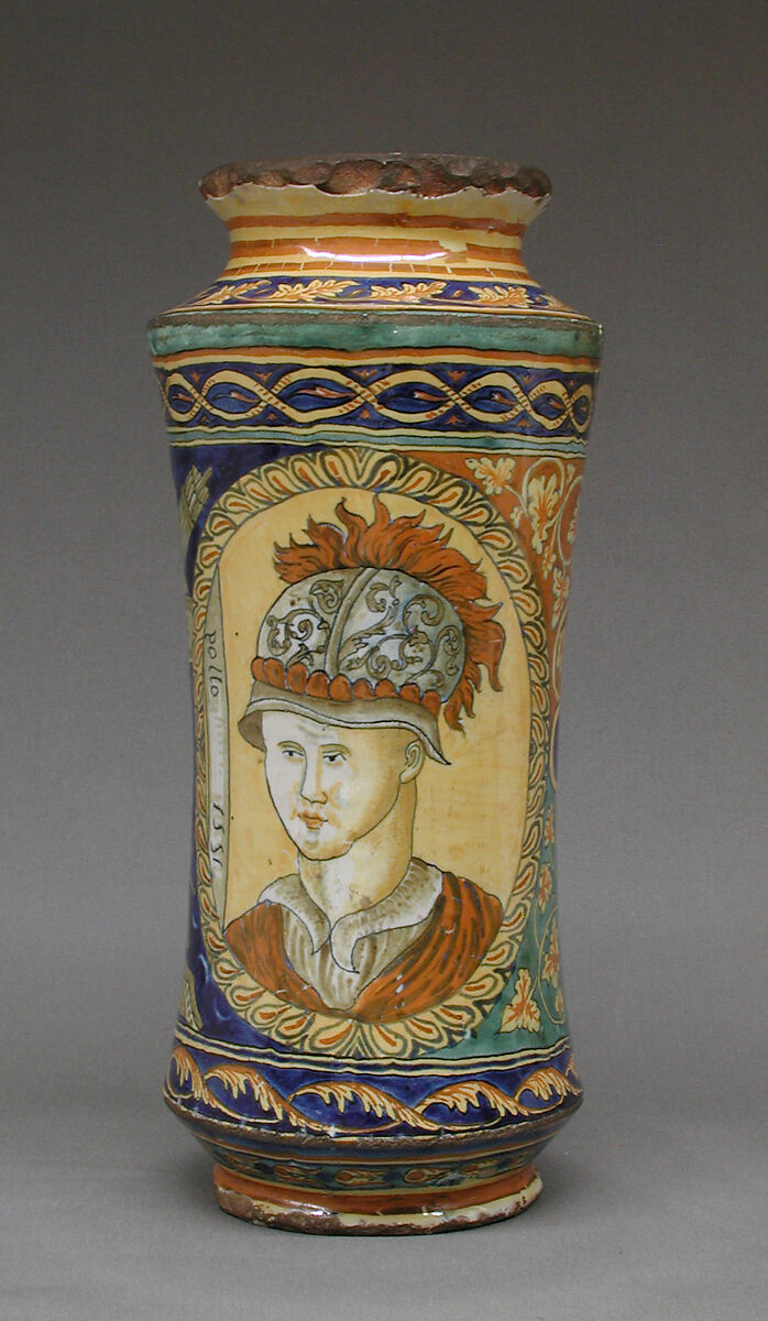 Storage vessels were among the most frequently produced maiolica wares in late medieval and Renaissance Italy. Made in fairly standard shapes, they were designed to fit with dozens of others on a shelf, often in a pharmacy or shop. Their handles therefore tend to fit within the vessel’s profile, and the cylindrical albarello type is generally narrower at the middle than at the top or bottom, making it easy to grip. Other common features include inscriptions indicating contents and flanged lips to help secure cloth or paper seals. The decoration, usually more elaborate on one side than the other, can sometimes link pieces to a known dispensary or specific workshop or artist.