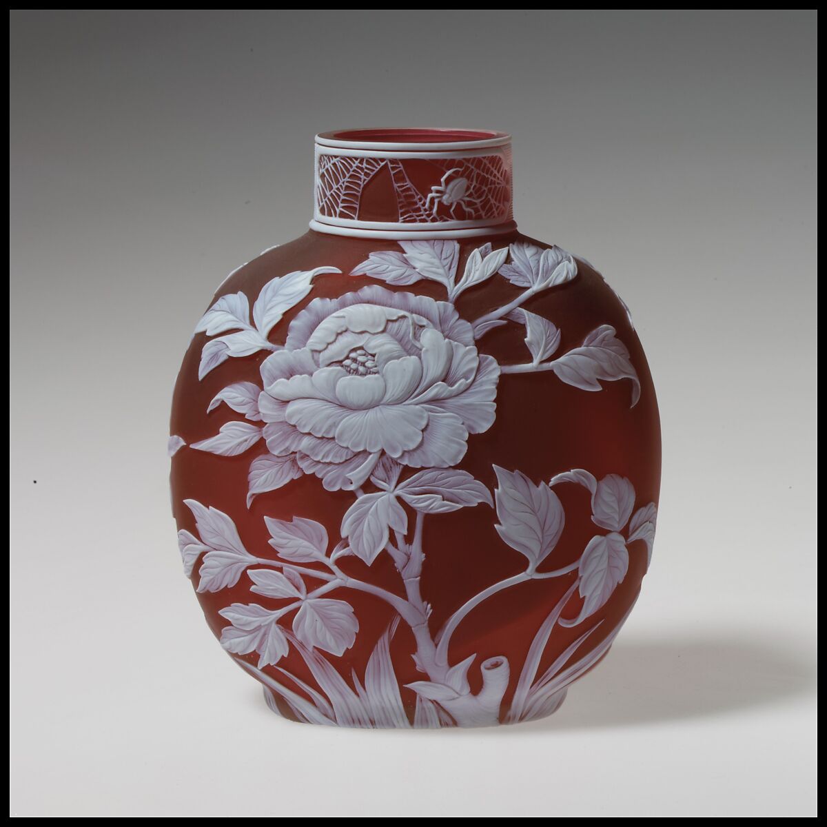 The anonymous skilled engraver used acid etching, wheel engraving, and carving with a hand-held blade to achieve a cameo effect upon "strata" of clear, crimson, and white glass. The spiderweb on the neck refers to the firm of Thomas Webb, a major reviver of cameo glass.