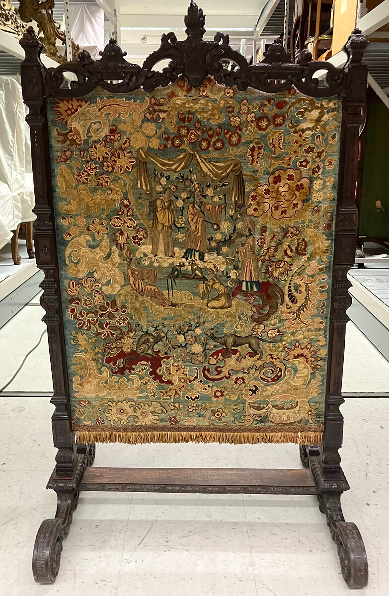 - Medium: Carved walnut frame; cross-stitch embroidery