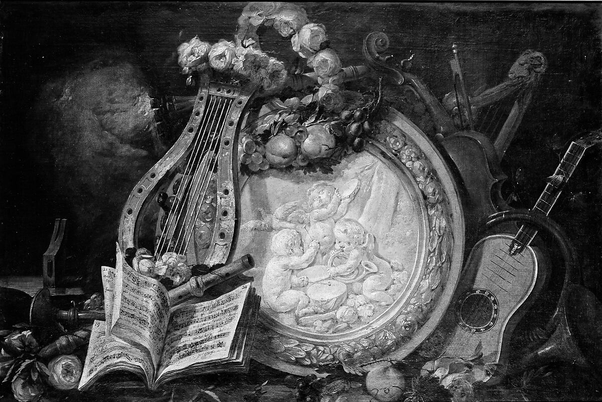 Putti Musicians in a Medallion, Surrounded by Musical Attributes, Flowers, and Fruit