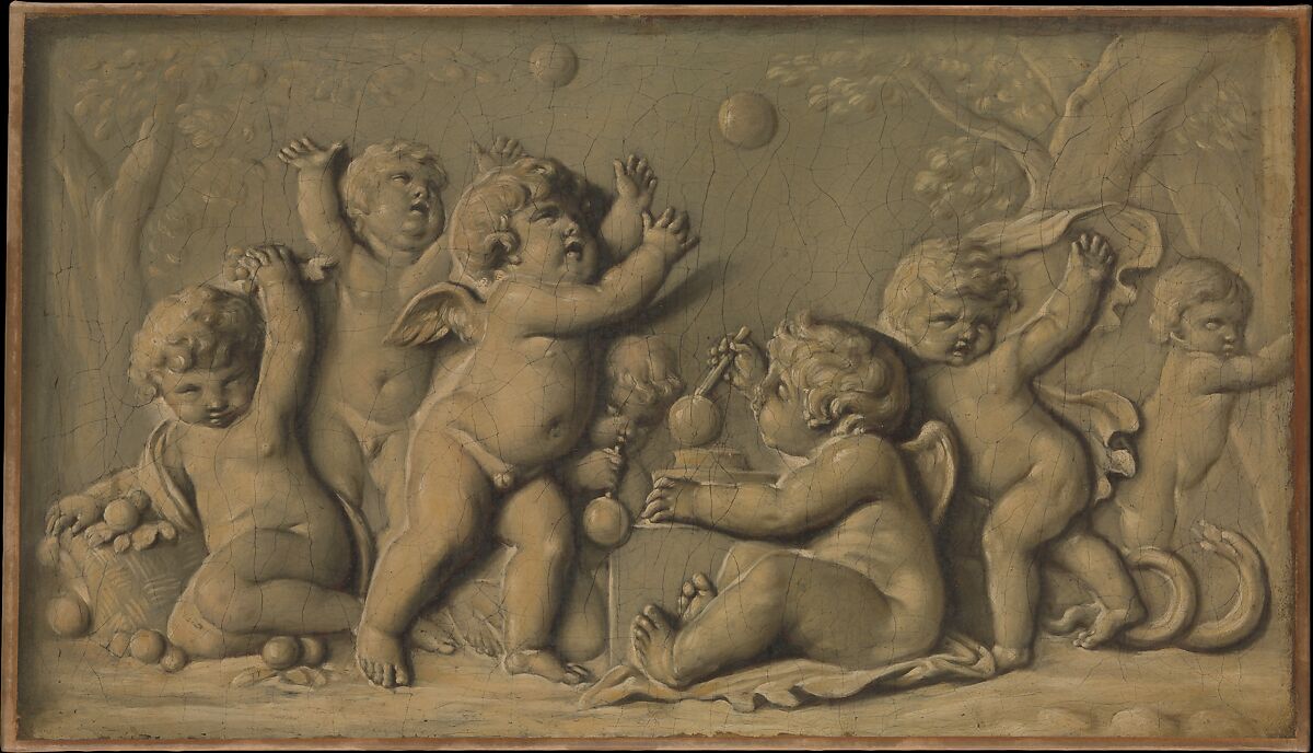 This pair of grisaille overdoors are painted in the manner of Piat Joseph Sauvage (1744–1818), a Flemish painter, known for his decorative paintings often using trompe l’oeil effects. It is possible that these two overdoors were part of a series representing the four elements. Water and fire are depicted on 07.225.315a – one putto holds an urn from which water flows, traditionally the depiction of a river god, while another holds a flaming torch. Air and earth are depicted on 07.225.315b – several putti play with bubbles, while another collects fruit and a third is frightened by a snake.