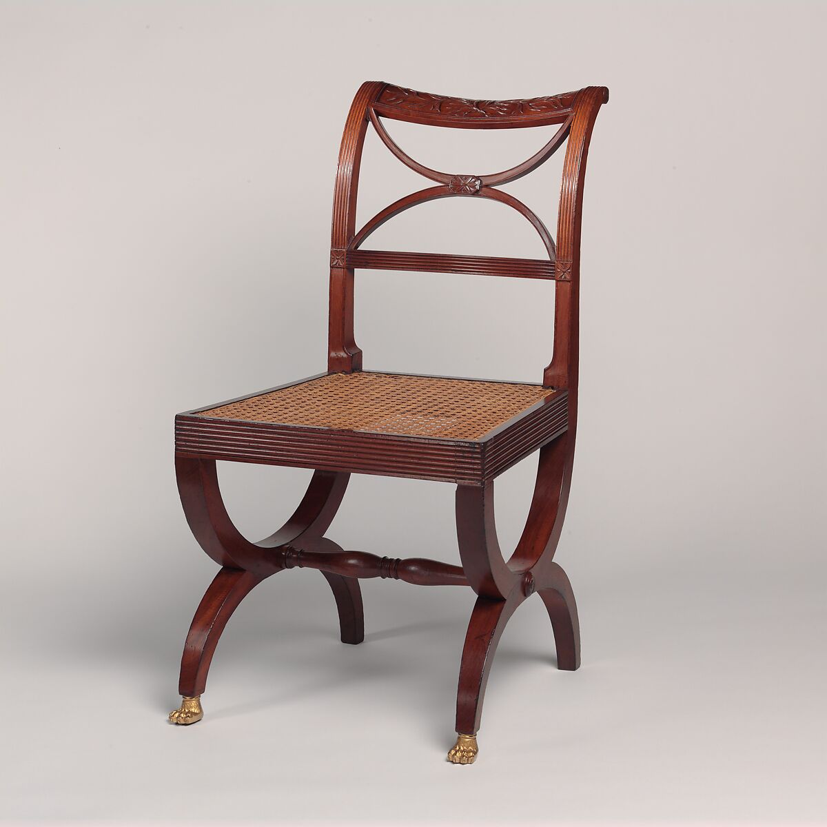 This chair and its nine mates are part of a set, including a sofa, two armchairs, and two foot stools. Other chairs from the set are owned by the Museum of The City of New York and Winterthur. The attribution to Duncan Phyfe is based on the provenance of the set and is strengthened by Phyfe's sketch, now at Winterthur, of a similar chair. This curule shape, also known as the Grecian cross, is based on a Roman magistrate's folding chair and appeared in many early nineteenth-century design books.