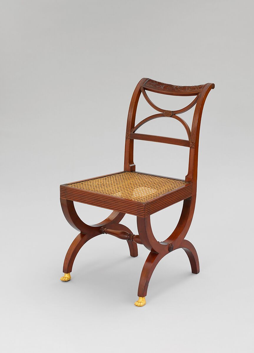 This chair and its nine mates are part of a set, including a sofa, two armchairs, and two foot stools. Other chairs from the set are owned by the Museum of The City of New York and Winterthur. The attribution to Duncan Phyfe is based on the provenance of the set and is strengthened by Phyfe's sketch, now at Winterthur, of a similar chair. This curule shape, also known as the Grecian cross, is based on a Roman magistrate's folding chair and appeared in many early nineteenth-century design books.