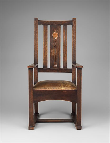 Gustav Stickley became an avid promoter of the Arts and Crafts Movement in America after his 1898 trip to England and his acquaintance of William Morris. He subsequently introduced a line called New Furniture, which featured the ponderous forms, visible construction, and stained oak of Craftsman furniture. This chair was part of a second generation of furniture made by Stickley beginning in 1903, characterized by solid forms relieved by areas of metal and exotic wood inlay. While this furniture has traditionally been attributed to Harvey Ellis, an architect who began working in Stickley’s shop in 1903, recent research has shown that Ellis was not solely responsible for this development, and that it might have been a collaborative effort among all of the designers at United Crafts. The delicate copper and pewter inlay pattern relates to the furniture of contemporary British designers M.H. Baillie Scott and Charles Rennie Mackintosh.