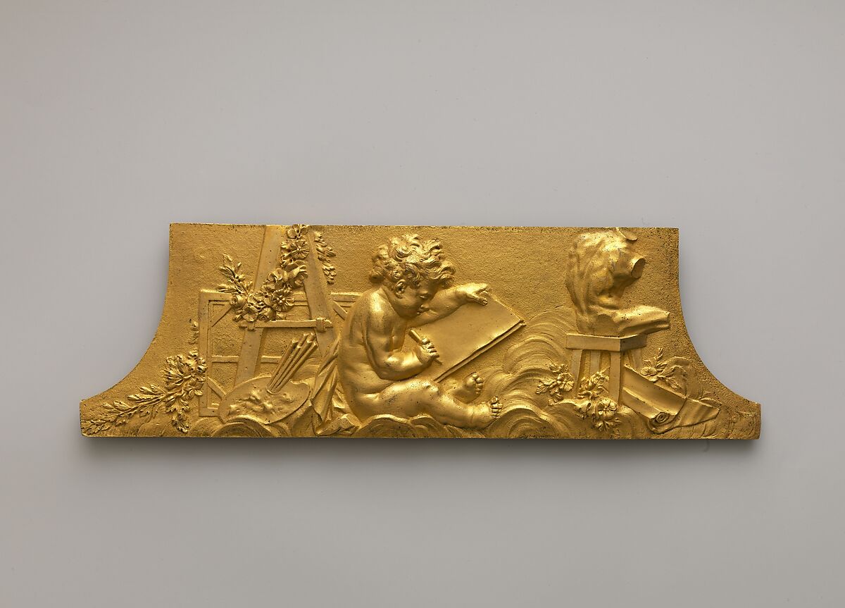 An allegory of the arts of drawing and painting, this shaped plaquette may have come from a piece of furniture by the cabinetmaker Jean-Henri Riesener (1734-1806) who worked frequently for Queen Marie Antoinette and for other members of the French court.