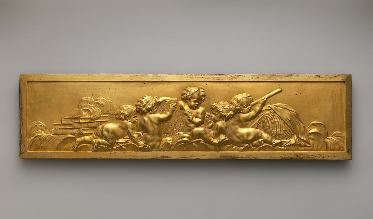 Depicting children symbolizing astronomy, this plaque was probably intended as frieze ornament for a piece of furniture. Jean-Henri Riesener (1734-1806) and other cabinetmakers working in the Neoclassical style used this kind of delightful allegorical scenes to embellish secretaries, commodes and tables. The lugs on the back are for invisible attachment from the rear.