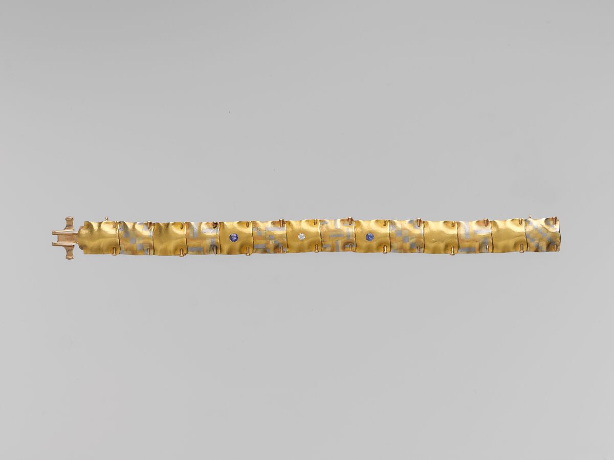 In this unusual design for a link bracelet, the firm of A.J. Hedges & Co. utilized their patented process for mottling yellow, white, red and green gold, a technique inspired by Japanese metalwork. Here the multicolored gold links imitate squares of checked cloth joined together by tiny gold pins. Set with a single diamond and two Montana sapphires, this clever trompe l’oeil conceit becomes a statement of both Aesthetic movement sensibilities and forward-looking modernist taste.