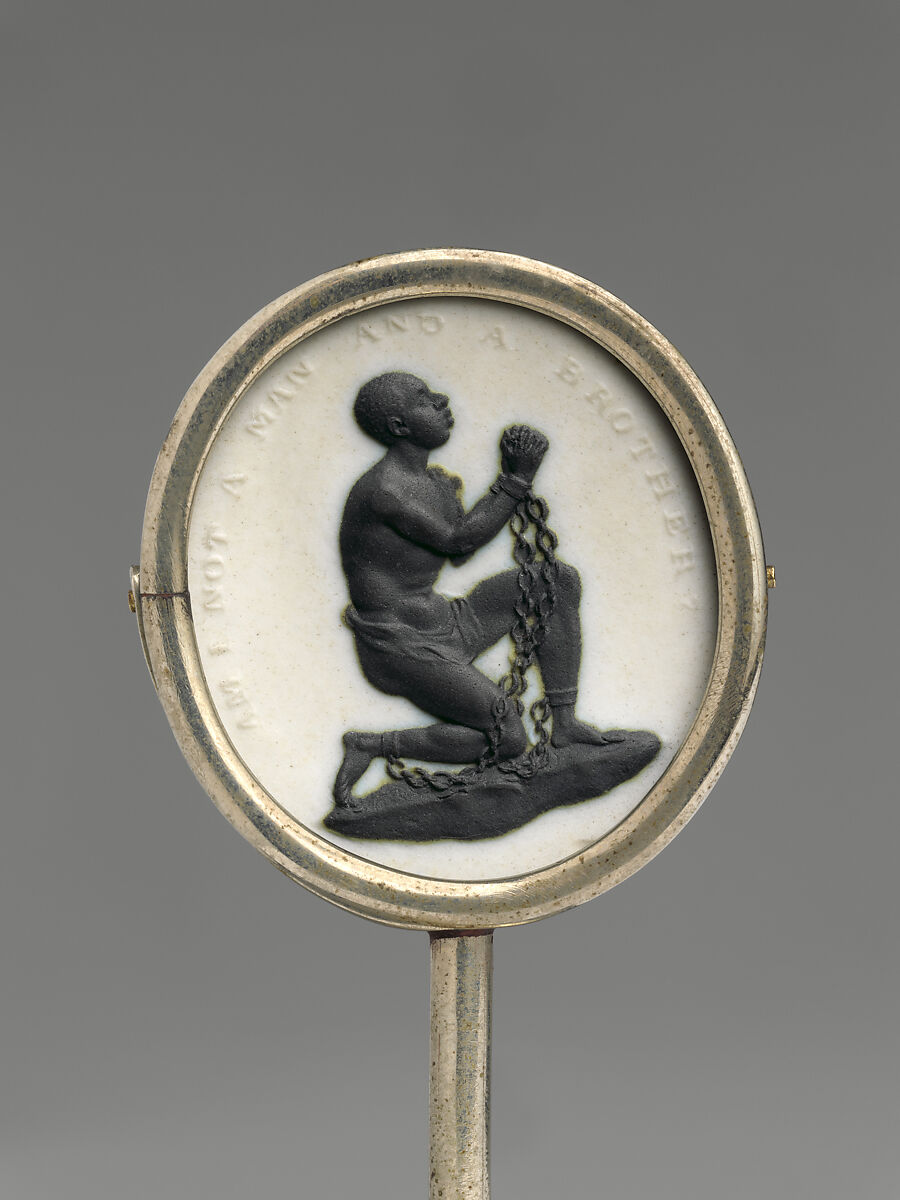 In 1787, the Wedgwood ceramics firm issued a cameo medallion featuring a kneeling and shackled Black man with the inscription, "Am I not a man and a brother?" After its adoption as the seal of the London-based Society for Effecting the Abolition of the Slave Trade, the image became an emblem of the antislavery movements in Britain, France, and the United States. Proliferating in printed abolitionist literature, it also appeared on a wide range of consumer goods including the carved gemstone seal depicting a kneeling Black woman with the reworked phrase, "Am I not a woman and a sister?" which also appears in this exhibition. Despite the successes of the antislavery movement, the ubiquity of the motif of the kneeling and beseeching Black figure cemented associations between Blackness, slavery, and subservience. Similar associations emerge in Carpeaux’s Why Born Enslaved!, which also pairs a bound Black figure with a petitioning inscription.