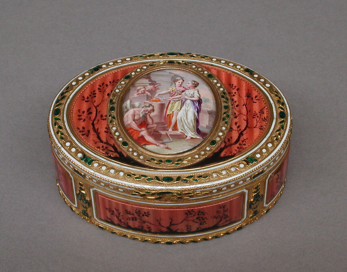 - Title: Snuffbox with scene of two maids and cupid at altar of love