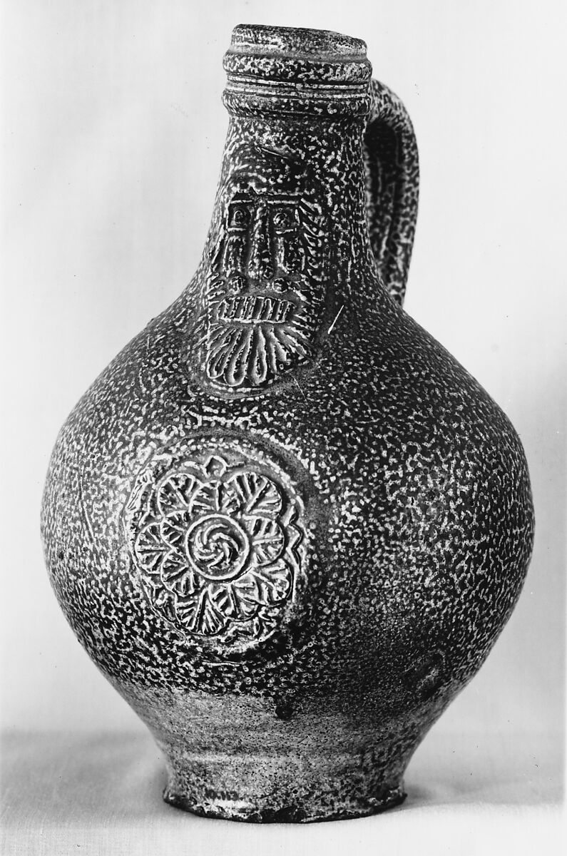 German “bearded man” stoneware jugs are known to have been used in seventeenth-century America. Stoneware is fired at a higher temperature than earthenware, hot enough to make the clay vitrify or change into a glasslike substance, resulting in a nonporous ceramic body. Thus, stoneware jugs made ideal long-term storage containers.