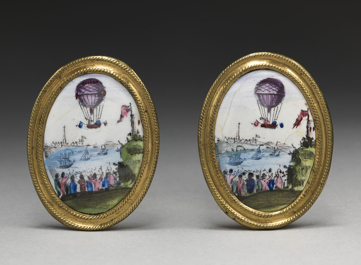 The gondola of the hydrogen balloon depicted on these knobs carries two aeronauts. It may well illustrate the first successful flight over the English Channel. On January 7, 1785, Jean-Pierre Blanchard and Dr. John Jeffries crossed from Dover to Calais by air. To make the balloon lighter and keep it afloat, the two men were forced to dump their ballast, throw away their cork life jackets, and even Dr. Jeffries’ pants!
