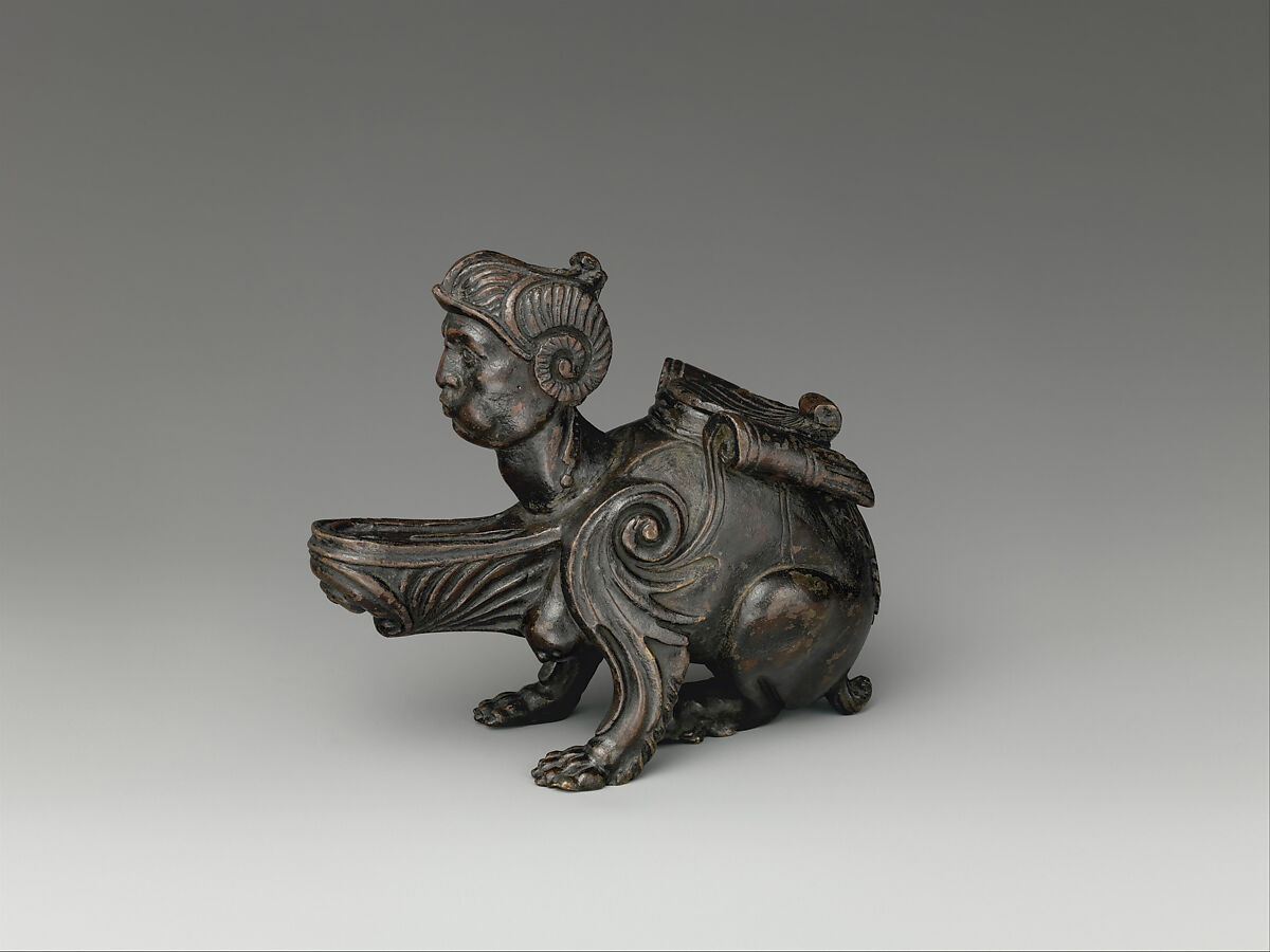 The Met’s bronze is a cast of a popular model that has been associated with the Paduan sculptor Riccio and his workshop as well as unrelated subsequent production over the following centuries. Riccio had included sphinxes in his designs for the Paschal Candelabrum in the Basilica di Sant’Antonio, Padua (p. 00, fig. 13c), and on the Della Torre tomb in San Fermo Maggiore, Verona. It is thought that such motifs migrated from these syncretistic religious monuments that combine pagan and Christian elements to the utilitarian objects in demand by Paduan collectors during this period, which included oil lamps, incense burners, and inkwells.