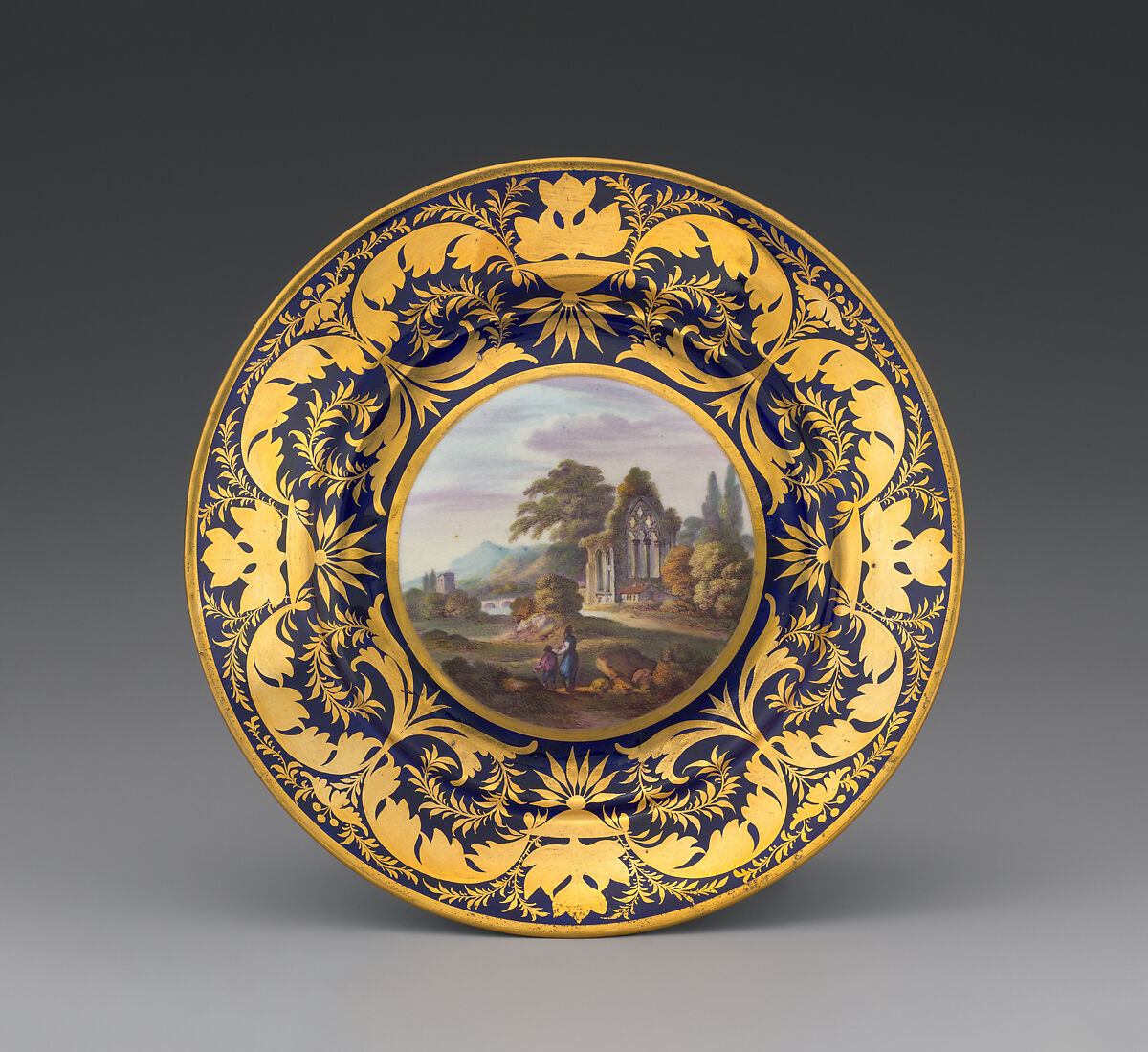 The scenes are painted in the style developed by John (act. 1782–1800) and Robert Brewer, painters at the Derby porcelain factory.