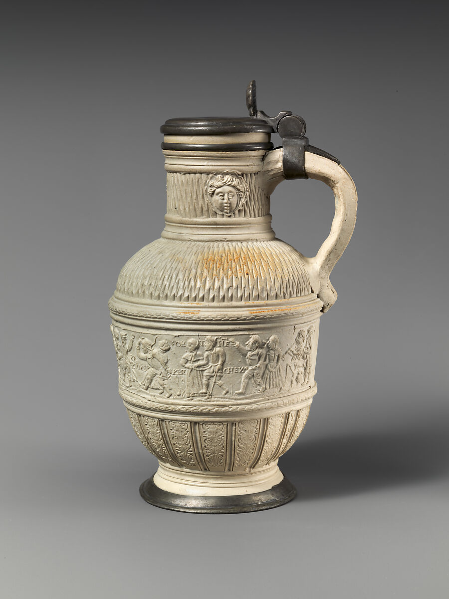 This stoneware was produced on speculation for a middle-market clientele. Though handmade, its decoration was quick work, pressed on with reusable molds based on designs lifted from prints. Siegburg potters developed a reputation for interesting forms and the latest styles rendered in a distinctive gray-white glaze; higher end pieces (like a related Siegburg stoneware ewer, 17.190.2058) boasted silver rather than pewter mounts. They were able to reach a huge market by distributing their work via trading posts controlled by the Hanseatic League, a powerful federation of merchant guilds and their market towns that included Lübeck, Cologne, London, Bruges, and later Antwerp and, to the north, Riga and Tallinn.