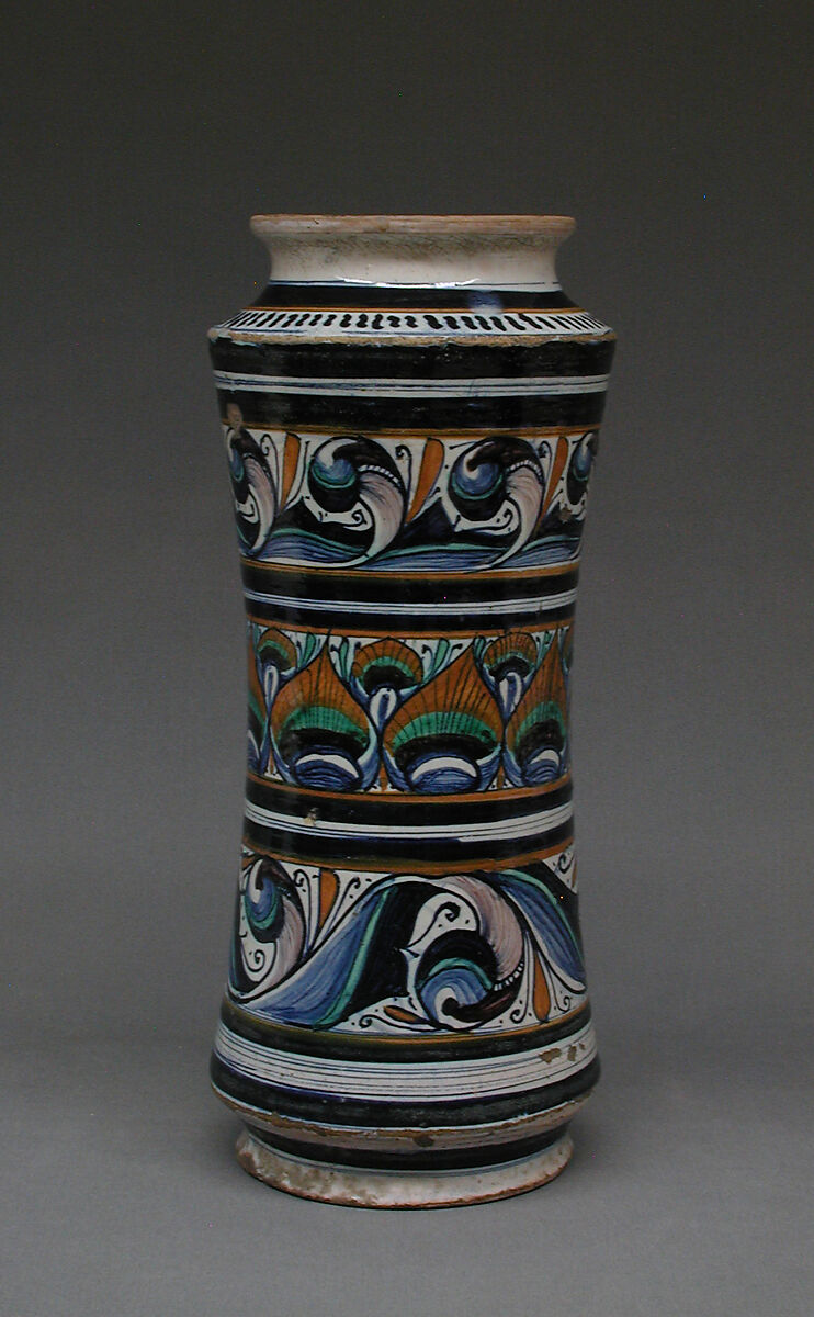 Storage vessels were among the most frequently produced maiolica wares in late medieval and Renaissance Italy. Made in fairly standard shapes, they were designed to fit with dozens of others on a shelf, often in a pharmacy or shop. Their handles therefore tend to fit within the vessel’s profile, and the cylindrical albarello type is generally narrower at the middle than at the top or bottom, making it easy to grip. Other common features include inscriptions indicating contents and flanged lips to help secure cloth or paper seals. The decoration, usually more elaborate on one side than the other, can sometimes link pieces to a known dispensary or specific workshop or artist.