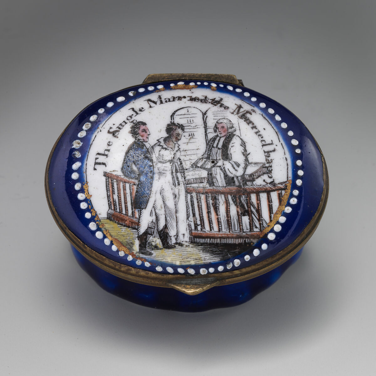 Enameled objects like this one, intended to imitate the lustrous quality of porcelain, were among the more affordable goods sold at toyshops across London and in fashionable English resort towns. Though often called "Battersea enamels" in common parlance (referring to the manufactory at York House, Battersea, operating only between 1753 and 1756), we rarely know exactly where individual pieces were made. The main centers of enamel production were in London, South Staffordshire (particularly in Bilston and Wednesbury), and Birmingham.