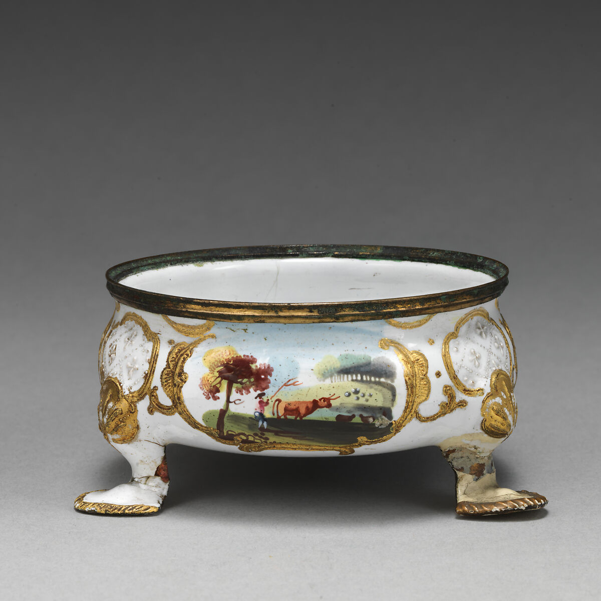 Enameled objects like this one, intended to imitate the lustrous quality of porcelain, were among the more affordable goods sold at toyshops across London and in fashionable English resort towns. Though often called "Battersea enamels" in common parlance (referring to the manufactory at York House, Battersea, operating only between 1753 and 1756), we rarely know exactly where individual pieces were made. The main centers of enamel production were in London, South Staffordshire (particularly in Bilston and Wednesbury), and Birmingham.