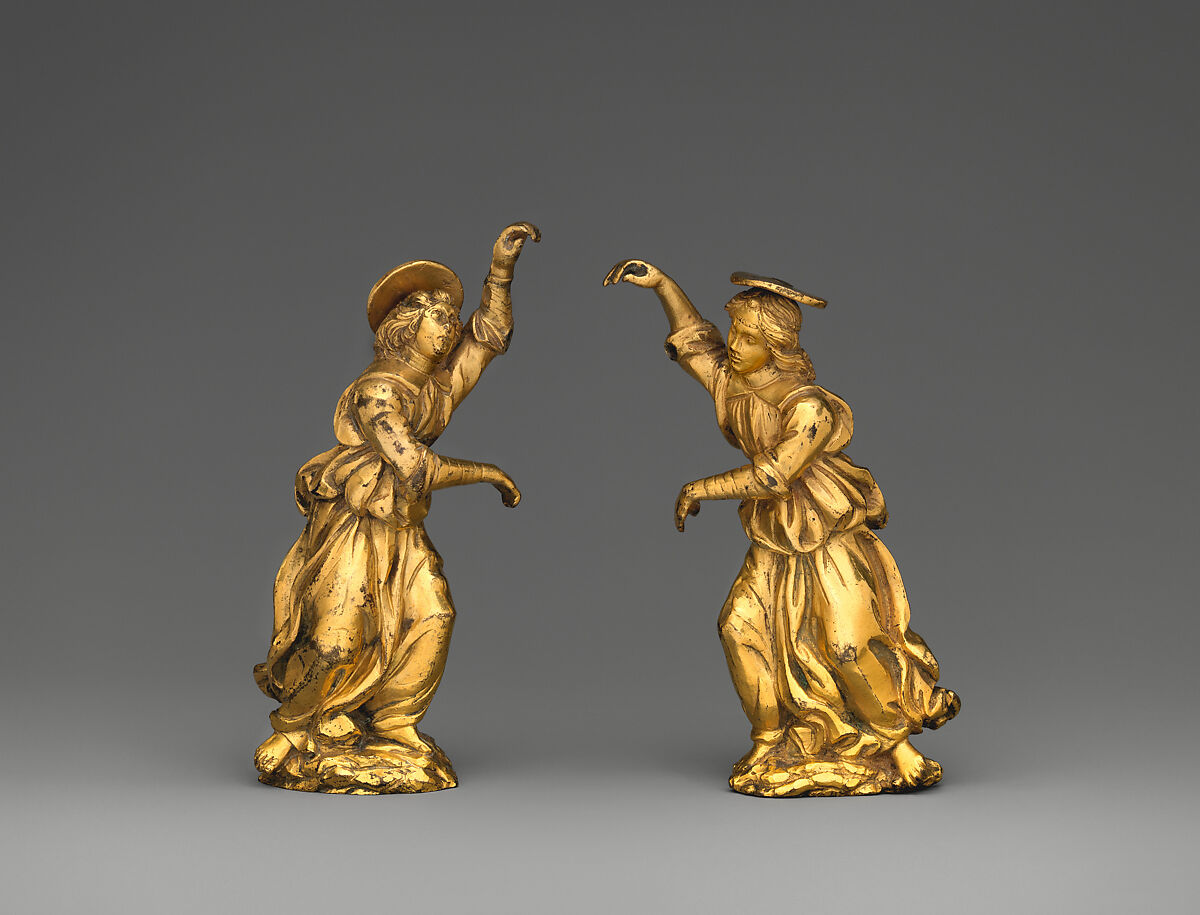 The angels, of a brassy metal, show well-preserved mercury gilding, burnishing, and some corrosion and rubbing. A faithful affirmation of quattrocento standards of modeling, as in the works of Antonio Pollaiuolo, Andrea del Verrocchio, Benedetto da Maiano, and their many emulators, is clear. The costumes, with ample peplums, rolled-back sleeves, and skirts curling up at the ankles, also exhibit a thorough understanding of current imagery. It is a favorable sign that the features and hairstyles do not match: the right-hand angel, with a longer, oval face, wears a finely faceted bandeau on his forehead. It may seem surprising in terms of the quattrocento that the two stand on rockery, not clouds, but then their original appearance and function are unclear and had been forgotten by the time they came to The Met.
