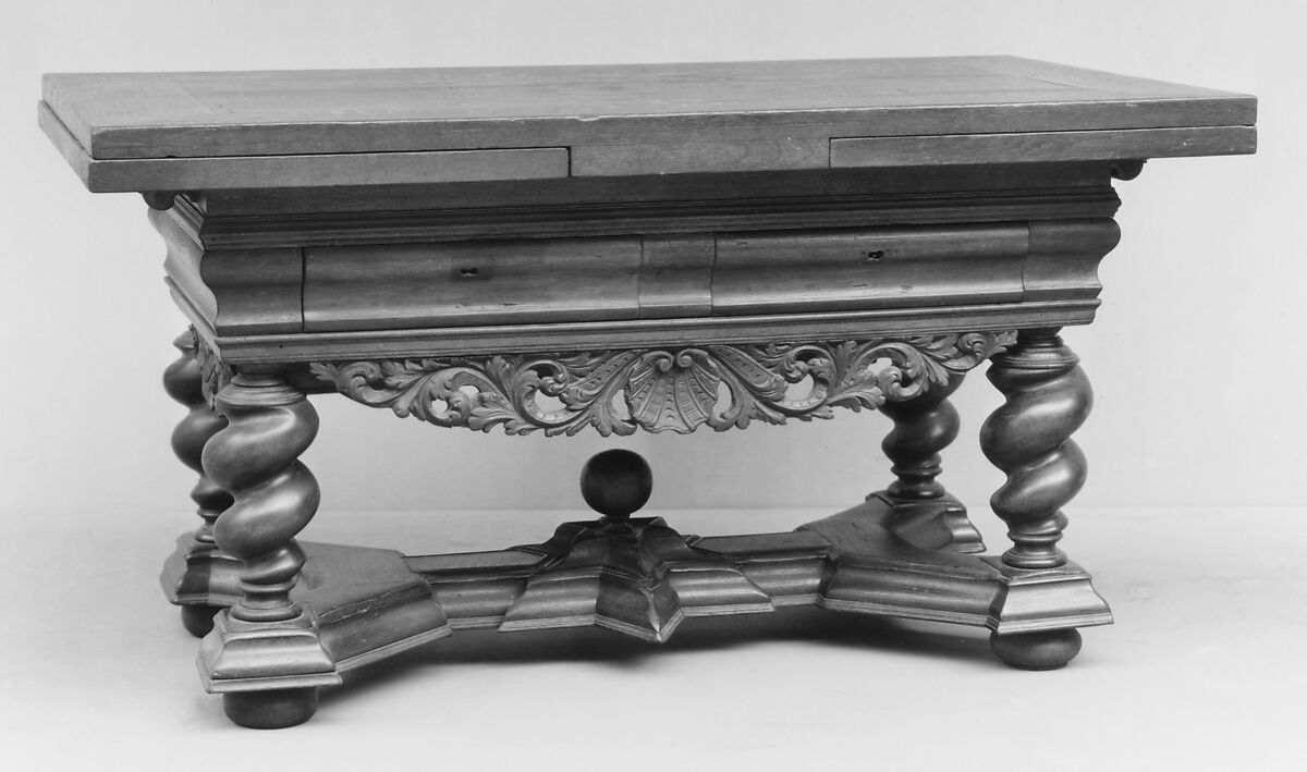 The solid turned legs and heavy stretcher of this table are typical of the region of Gdansk (formerly Danzig) in Poland.
