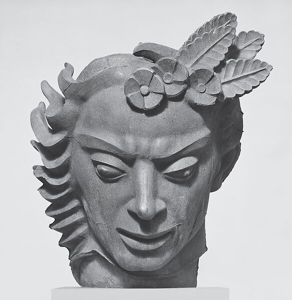 Orpheus, the son of Apollo and a muse, charmed or soothed gods, people, and even stones with his melodious voice and lyre. His wife Eurydice was fatally bitten by a snake. Sick with grief over her death, Orpheus descended to Hades to find her. Seduced by his song, the god Pluto gave him permission to retrieve Eurydice on the condition that he not look back at her during their journey to the upper world. Unable to resist, Orpheus peeked at his bride and she slipped back into blackness, lost to him forever. This heroic, sharply stylized head is excerpted from the twenty-six-foot central figure of the "Orpheus Fountain," installed in 1936 in front of the Stockholm Concert Hall in Milles’s native Sweden. In that version, Orpheus plays his lyre as he towers above eight figures awakening to his divine music. The Museum’s head, excised from its original context, alludes to Orpheus’s unfortunate demise—he was torn limb from limb by a group of maenads and his severed head floated off toward Lesbos, the island of female poets.