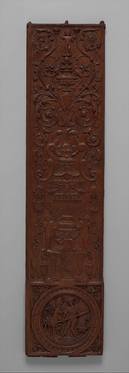 These panels constitute an early example of the French use of the ancient candelabra motif, favored in Italy, in which abstract ornament, fantastic beings, fruits, and foliage are combined in a vertical arrangement. The roundels at the bottom feature pairs of figures or scenes, such as Saint George slaying the dragon and a musician performing with his dancing dog next to a woman holding a monkey, as well as a profile portrait of the patron, Cardinal Georges d’Amboise (1460–1510). The panels were originally part of a screen separating the choir from the rest of the chapel at the cardinal’s celebrated château de Gaillon in Normandy. The Rouen woodworker Colin Castille supervised the carving of the panels, one of which is based on a design by Giovanni Pietro da Birago (act. 1490-1513).