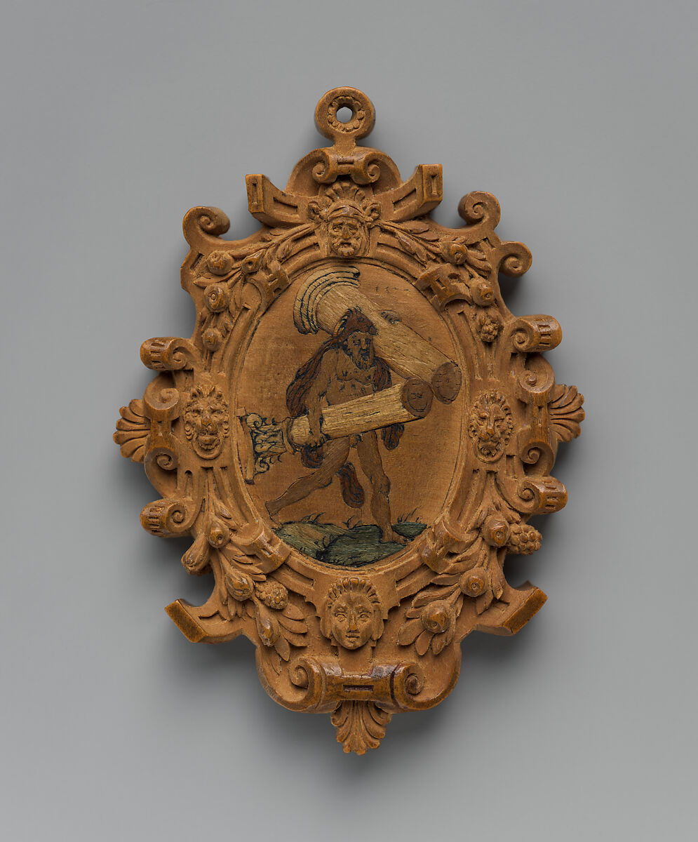 This meticulously crafted wooden jewel pendant was probably intended as a display piece for a Kunstkammer, or collector's cabinet (see 25.135.112), demonstrating the technical skill of its maker (see 17.190.643). The 1586 inventory of the famous "Amerbach cabinet," a bourgeois Kunstkammer in Basel that evolved from the collection of the humanist Erasmus of Rotterdam (ca. 1466–1536), mentions no less than 770 different goldsmith's models in various media. This example depicts scenes from the life of a mythological hero: Hercules, with Antaeus (in bas-relief), and on the reverse, Hercules bearing the two pillars of Gibralter (in marquetry).
