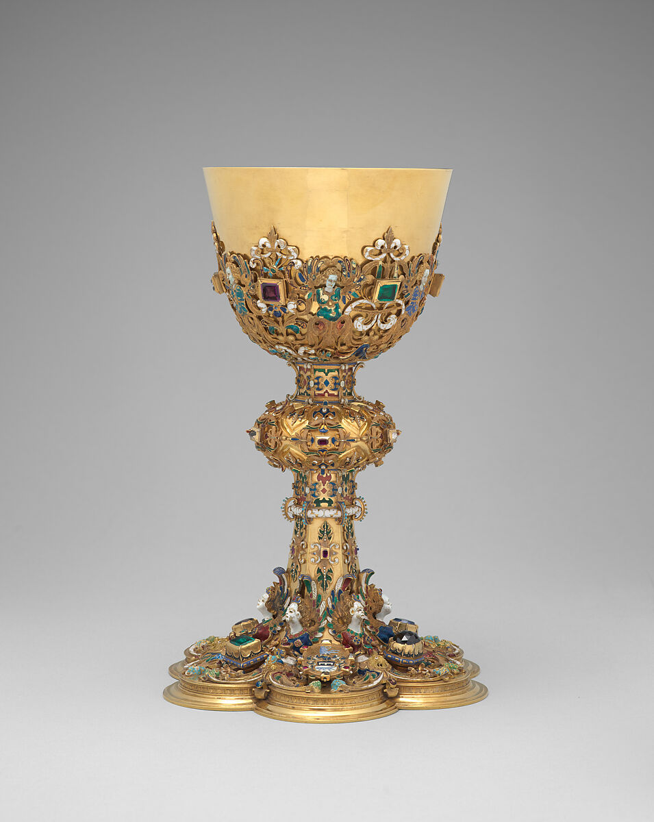 This densely ornamented vessel with inset colored gemstones was made for the dean of Speyer Cathedral, Adolph Wolff von Metternich zur Gracht, to use in celebrating Mass. The radiant angels are enameled in the round (en ronde bosse), a French technique developed during the fourteenth century that uses molten-glass colors to paint over a sculpted gold core. The chalice’s damaged bowl was carefully replaced with a new one in the nineteenth century.