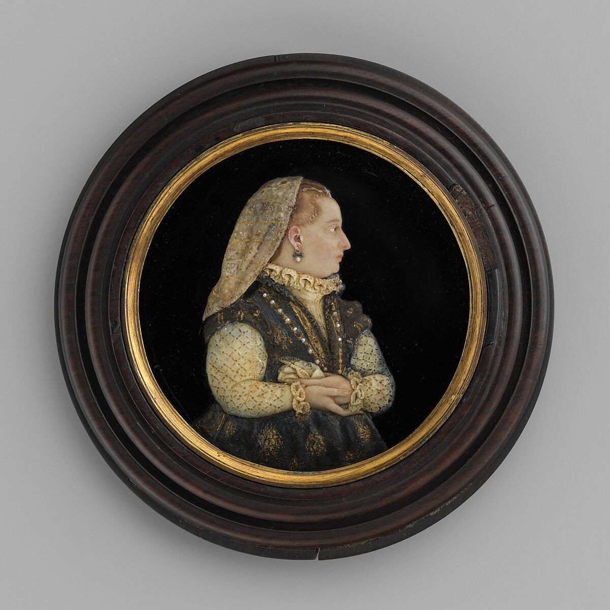 - Medium: Relief: pigmented wax, black glass, seed pearls, gilding; frame: glass, gilded and black wood