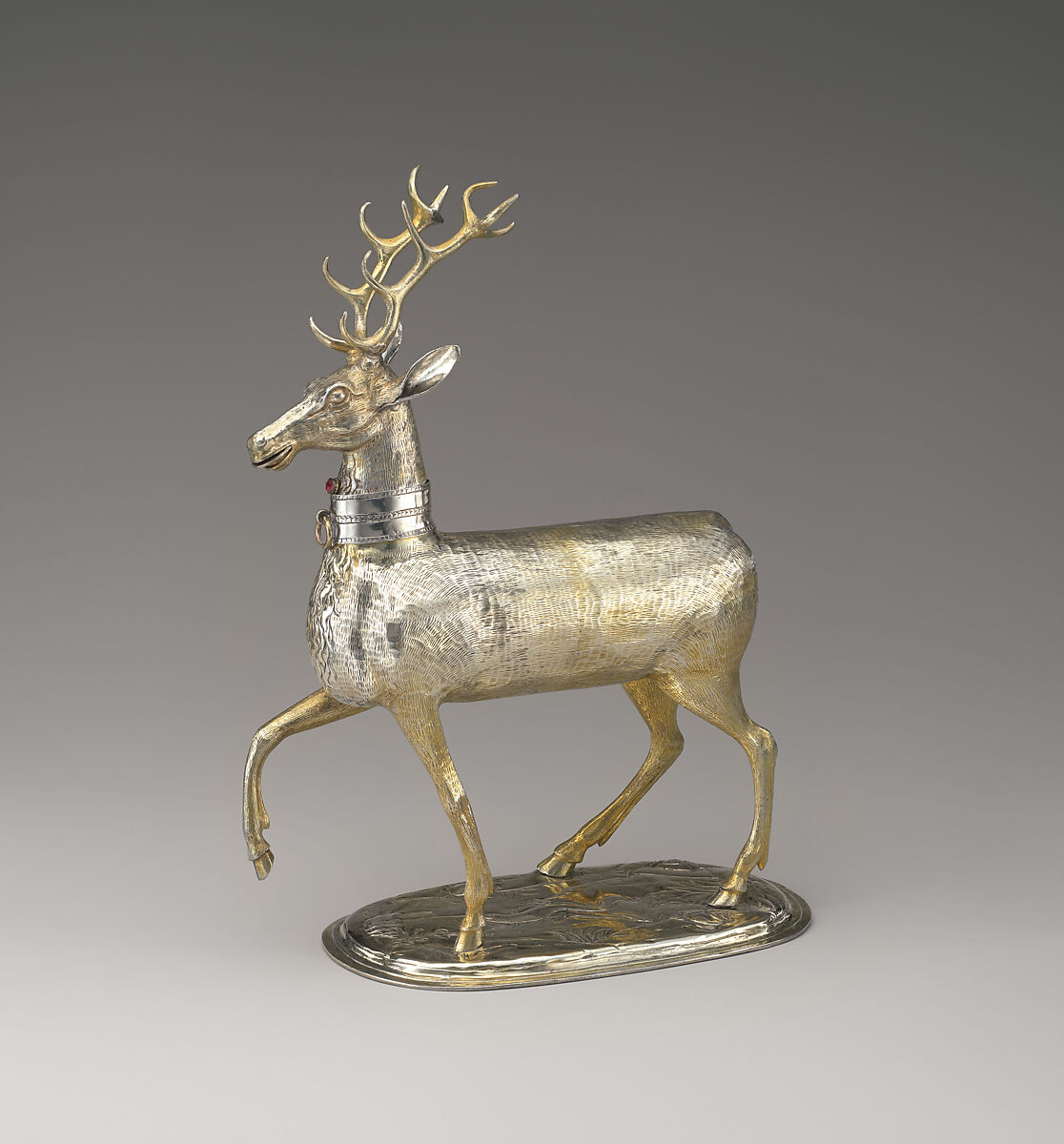 Hunting and falconry were central to aristocratic life, and cups in the form of game animals or pets were popular tableware for court banquets and their associated rituals. Sometimes known as Wilkomm cups, their removable heads could be filled with wine or spirits and offered to guests in greeting, who would then finish their contents in one gulp. Banqueting was important in other institutional settings too, making Wilkomm cups essential accoutrements for town, city, and guild officials.