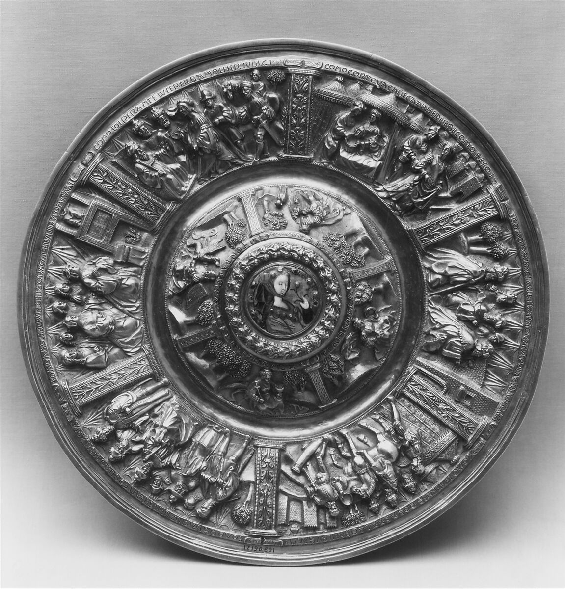 Personifications of Hope, Temperance, Faith, and Fortitude are embossed on the inner ring of the dish. The enamel medallion at the center is a later addition.