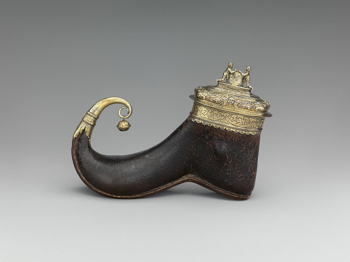 The form of the pointed shoe, or Schnabelschuh, that appears in this embroidered shield (1983.364) and leather cup (17.190.608a, b) indicates that both works are associated with the shoemakers’ guild. Its elongated tip mocks a style popular with the nobility of the fifteenth century. The leather cup, called a blackjack, may have been used for toasts of allegiance to the guild, and embroidered shields like this one would have been draped over coffins during funeral processions honoring guild members.