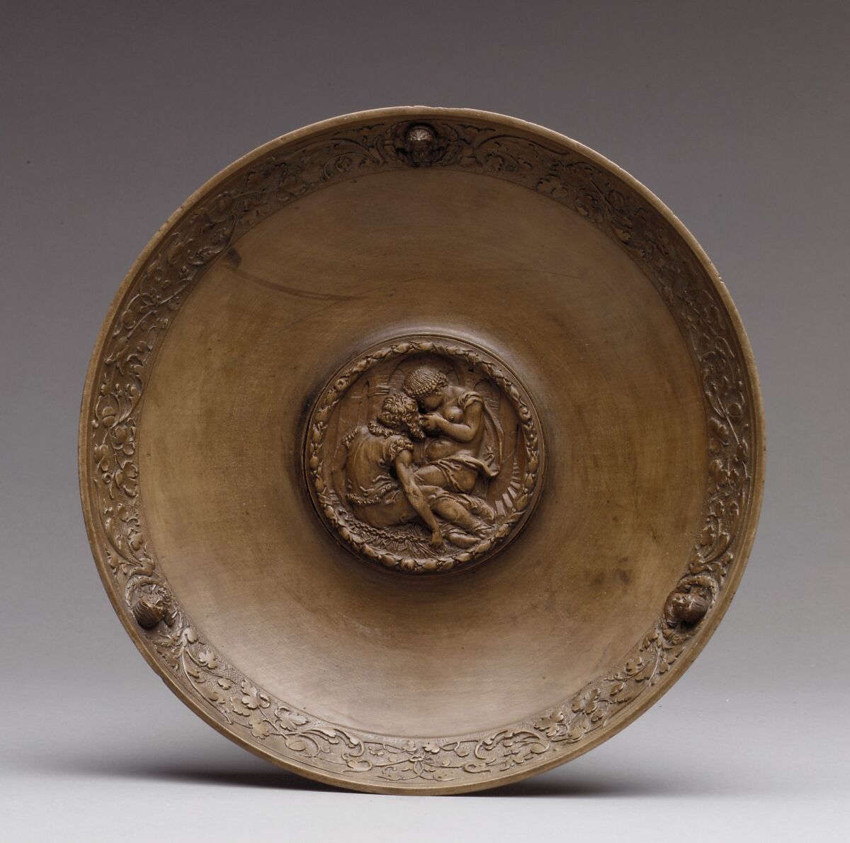 This is a goldsmith's model. The center medallion representing Roman Charity recalls the work of the Nürnberg painter and engraver Georg Pencz.