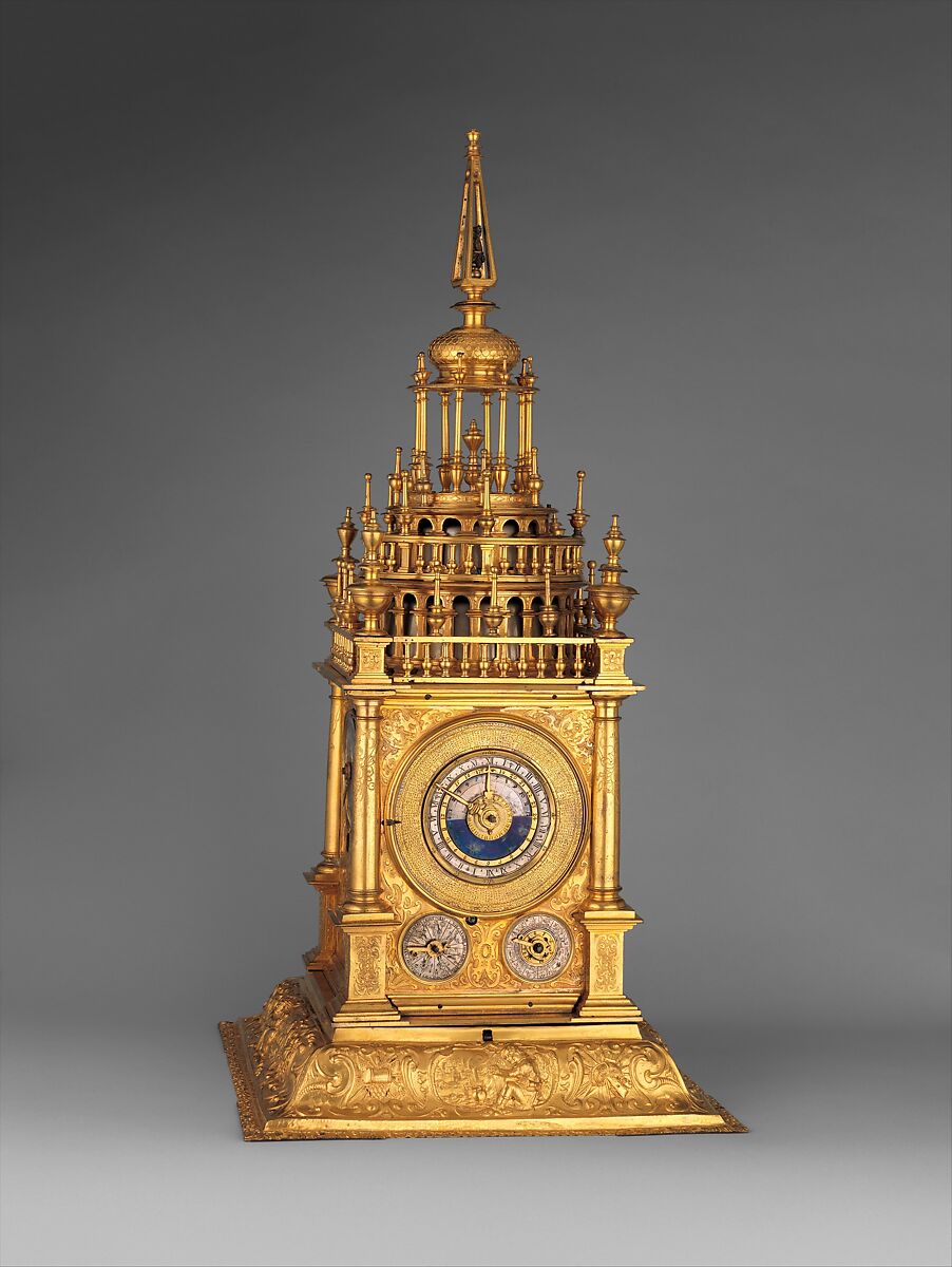 This triad of exceptional renaissance clocks, along with several other extraordinary timepieces, entered the Metropolitan Museum’s collection as part of the transformative gift of J. Pierpont Morgan.[3] Although watches were clearly Morgan’s great passion and formed the majority of the donation (17.190.747; 17.190.639; 17.190.634a–d), a guidebook of 1914 remarks, “this collection gives the student a complete illustration not only of the gradual and steady progress of horological art, but also of the beauty of some of the finest examples of it in existence.” [4]