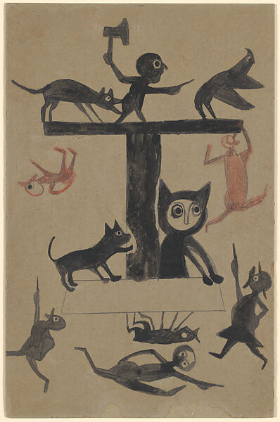 Born into enslavement in rural Alabama, Traylor—one of the most significant Black artists of the twentieth century—experienced first-hand dramatic historical change in the United States, including enslavement, emancipation, Reconstruction, Jim Crow segregation, and the Great Migration. Around 1939, at the age of 86, Traylor began spending his days drawing the life around him in the capitol-city of Montgomery, Alabama, as well as revisiting events from his own past. Working with an innate sense of design and storytelling, his radically distinctive renderings are striking in their disregard for spatial depth and proportion. By the time of his death in 1949, Traylor had created over 1,000 pencil drawings and gouache paintings on pieces of found cardboard. The artist's powerful imagery records his unique perspective on African American life in the early 20th-century urban South. This lively representation of five frenzied human figures and animals—grasshopper, rooster, dogs, and a singular wide-eyed cat—positioned around a T architectural form and base, is among Traylor’s most detailed compositions.