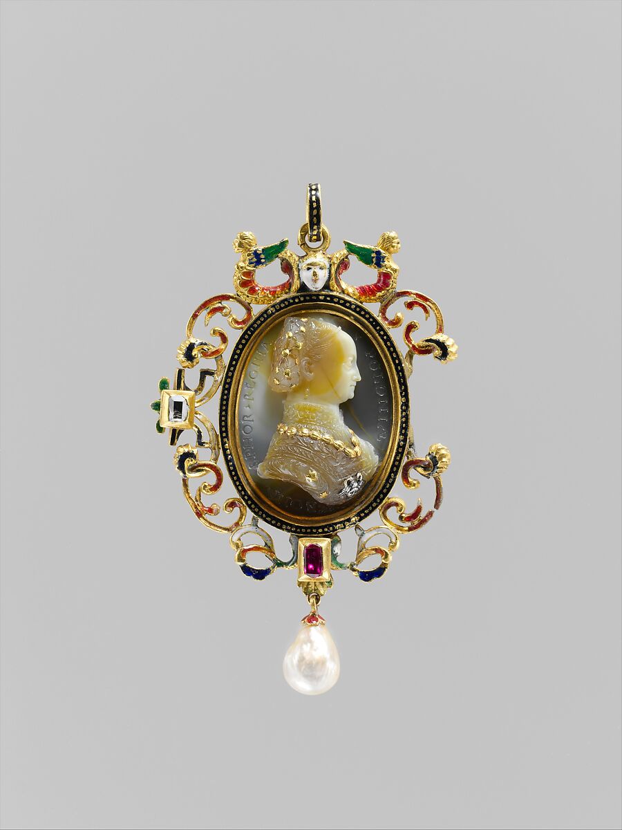 - Medium: Sardonyx, with inlaid gold and silver details; mounted in 19th century frame as a pendant in gold, with enamel, pearl and ruby