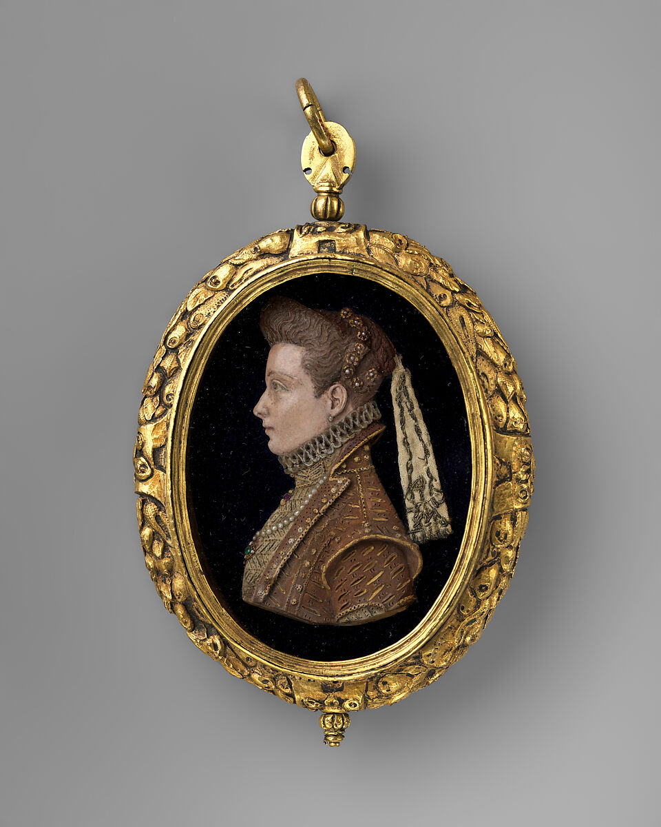 - Medium: Pigmented wax, seed pearls, emerald, ruby, linen, metal thread; gilded-copper or brass alloy, glass