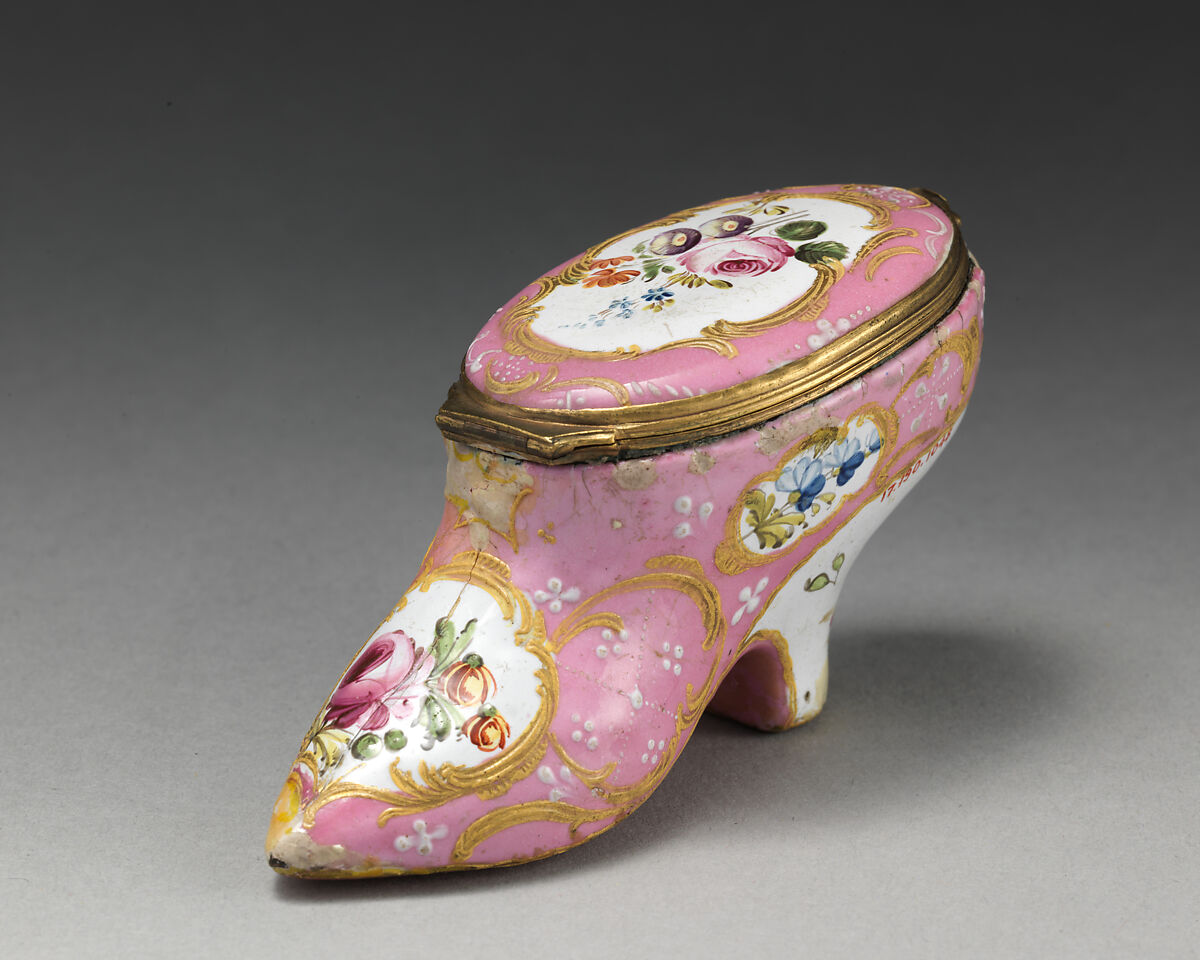 Enameled objects like this one, intended to imitate the lustrous quality of porcelain, were among the more affordable goods sold at toyshops across London and in fashionable English resort towns. Though often called "Battersea enamels" in common parlance (referring to the manufactory at York House, Battersea, operating only between 1753 and 1756), we rarely know exactly where individual pieces were made. The main centers of enamel production were in London, South Staffordshire (particularly in Bilston and Wednesbury), and Birmingham.