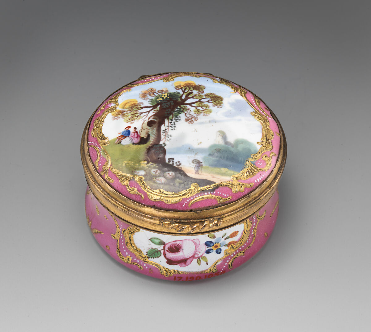 Enameled objects like this one, intended to imitate the lustrous quality of porcelain, were among the more affordable goods sold at toyshops across London and in fashionable English resort towns. Though often called "Battersea enamels" in common parlance (referring to the manufactory at York House, Battersea, operating only between 1753 and 1756), we rarely know exactly where individual pieces were made. The main centers of enamel production were in London, South Staffordshire (particularly in Bilston and Wednesbury), and Birmingham.