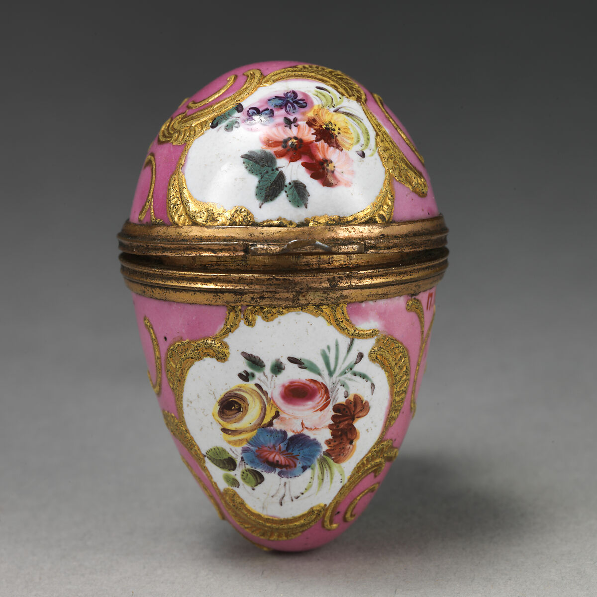 Enameled objects like this one, intended to imitate the lustrous quality of porcelain, were among the more affordable goods sold at toyshops across London and in fashionable English resort towns. Though often called "Battersea enamels" in common parlance (referring to the manufactory at York House, Battersea, operating only between 1753 and 1756), we rarely know exactly where individual pieces were made. The main centers of enamel production were in London, South Staffordshire (particularly in Bilston and Wednesbury), and Birmingham.