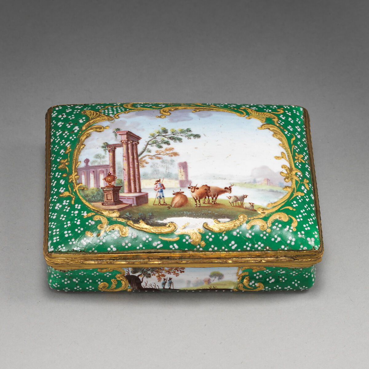 Enameled objects like this one, intended to imitate the lustrous quality of porcelain, were among the more affordable goods sold at toyshops across London and in fashionable English resort towns. Though often called "Battersea enamels" in common parlance (referring to the manufactory at York House, Battersea, operating only between 1753 and 1756), we rarely know exactly where individual pieces were made. The main centers of enamel production were in London, South Staffordshire (particularly in Bilston and Wednesbury), and Birmingham.
