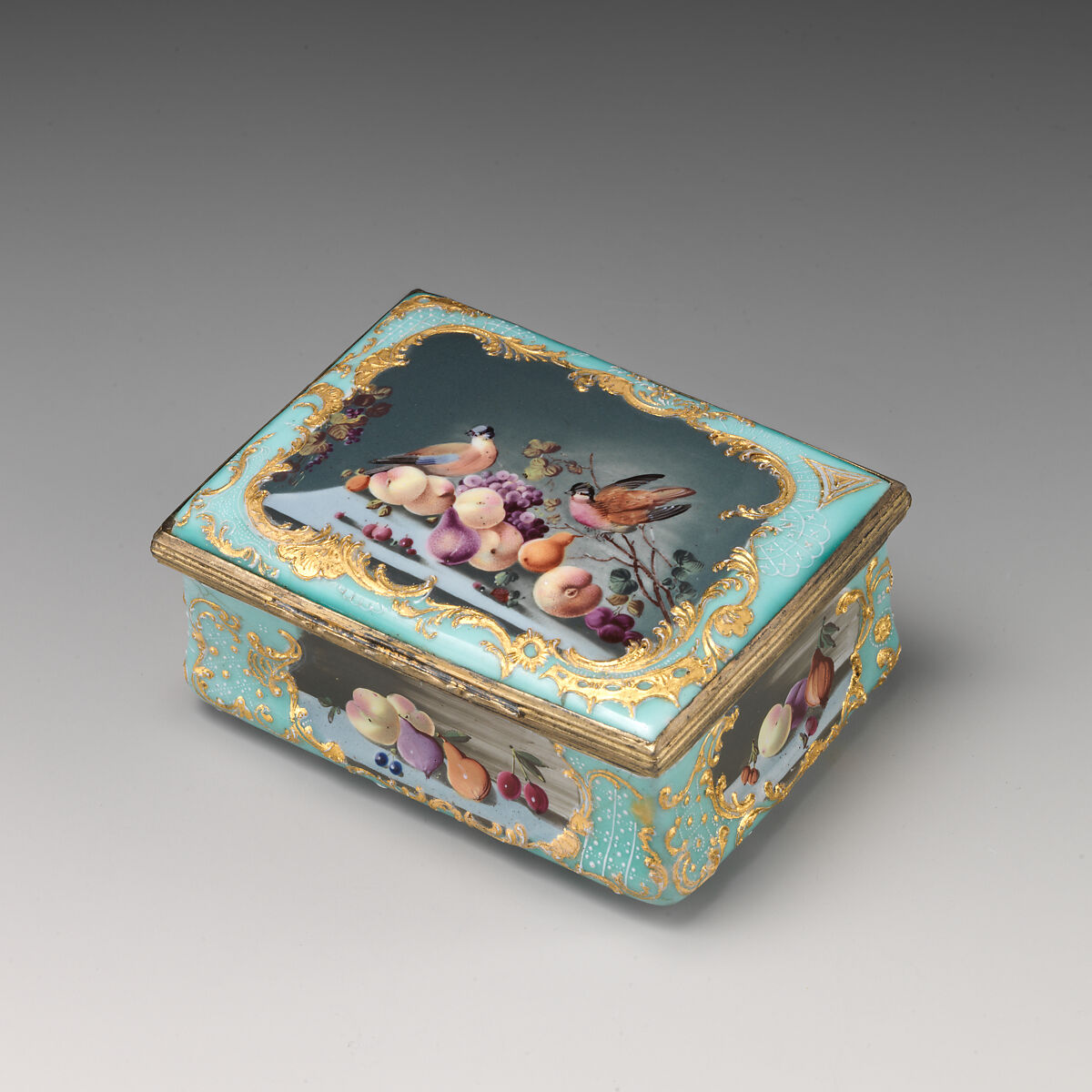 Enameled objects like this one, intended to imitate the lustrous quality of porcelain, were among the more affordable goods sold at toyshops across London and in fashionable English resort towns. Though often called "Battersea enamels" in common parlance (referring to the manufactory at York House, Battersea, operating only between 1753 and 1756), we rarely know exactly where individual pieces were made. The main centers of enamel production were in London, South Staffordshire (particularly in Bilston and Wednesbury), and Birmingham.