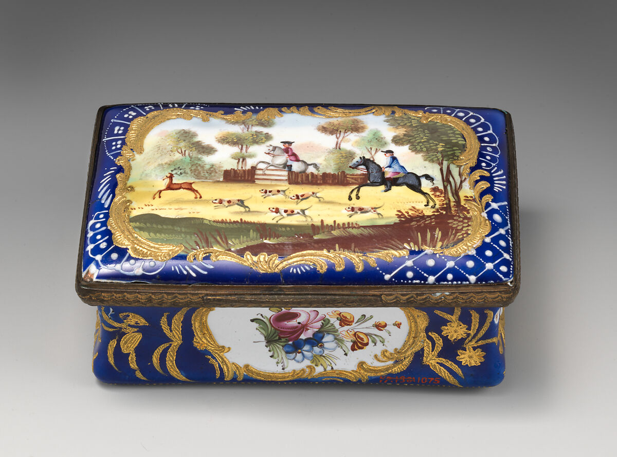 Enameled objects like this one, intended to imitate the lustrous quality of porcelain, were among the more affordable goods sold at toyshops across London and in fashionable English resort towns. Though often called "Battersea enamels" in common parlance (referring to the manufactory at York House, Battersea, operating only between 1753 and 1756), we rarely know exactly where individual pieces were made. The main centers of enamel production were in London, South Staffordshire (particularly in Bilston and Wednesbury), and Birmingham.