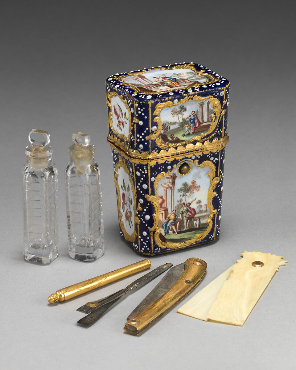 A variety of useful articles could be tucked away into the individual compartments inside a nécessaire, or a portable container that served the same function as an étui. This case contains two perfume vials, a double-ended implement with tweezers on one side and a nail file on the other, a penknife, a pencil holder, and two ivory tablets for jotting down notes.