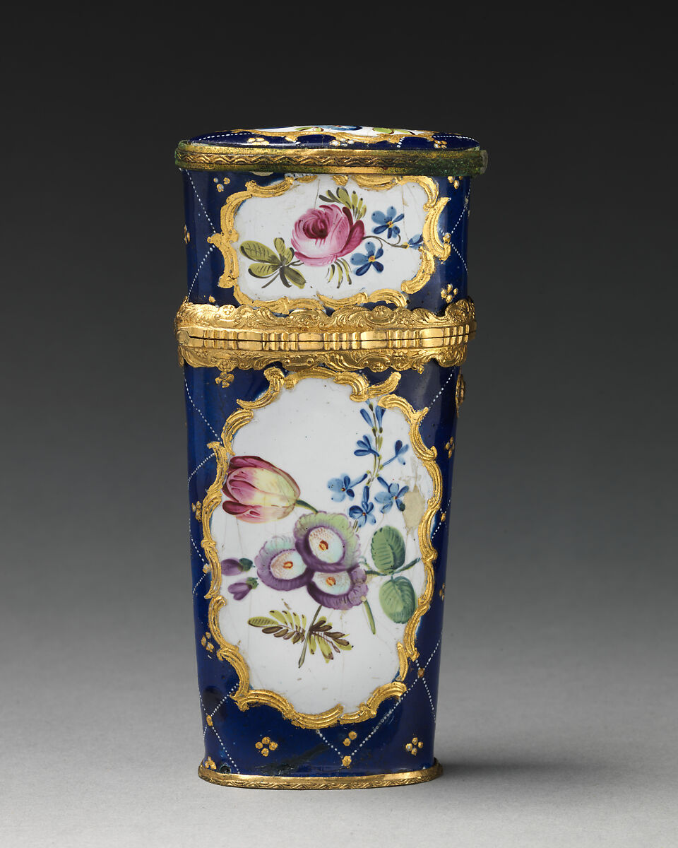 Enameled objects like this one, intended to imitate the lustrous quality of porcelain, were among the more affordable goods sold at toyshops across London and in fashionable English resort towns. Though often called "Battersea enamels" in common parlance (referring to the manufactory at York House, Battersea, operating only between 1753 and 1756), we rarely know exactly where individual pieces were made. The main centers of enamel production were in London, South Staffordshire (particularly in Bilston and Wednesbury), and Birmingham.