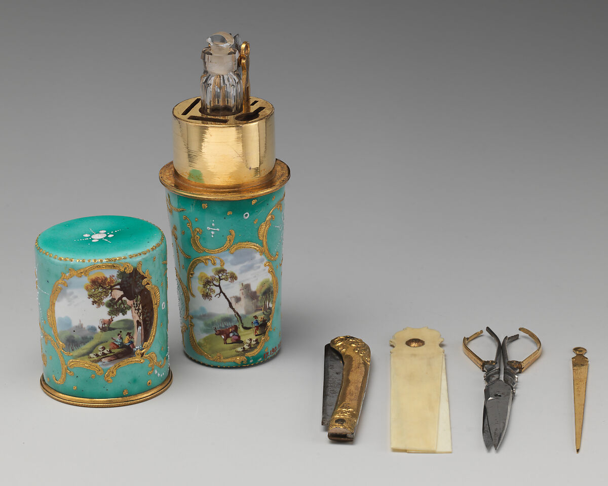 A variety of useful articles could be tucked away into the individual compartments inside an étui, a portable container that served the same function as a nécessaire. This case contains a penknife, scissors, two ivory tablets for jotting down notes, a double-ended implement with tweezers on one side and a nail file on the other, a bodkin (an oversized sewing needle used to tie together separate pieces of clothing, such as sleeves, with ribbon), a toothpick (its handle also functioning as an ear scooper), a pencil holder, and a perfume vial.