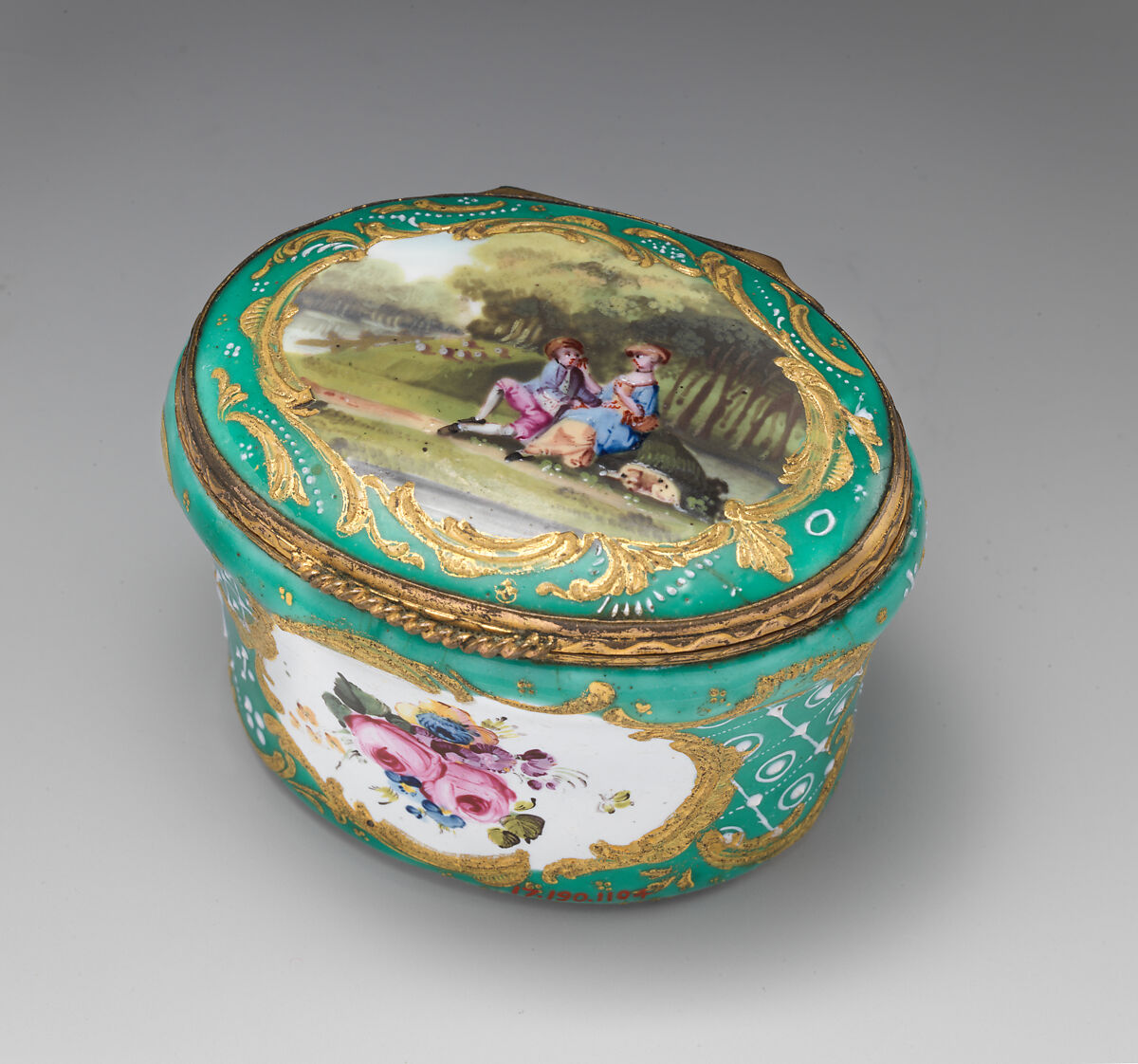 The couple at the center of the pastoral scene decorating this box’s lid is derived from Pensant-ils au Raisin?, a 1747 painting by François Boucher, later engraved by Jacques Philippe Le Bas (one of these prints is housed in The Met’s collection (1970.522.2)). The enameller may have been familiar either with Le Bas’ print or with Robert Hancock’s design, known as Peeping Tom, adapted from Boucher’s original composition.