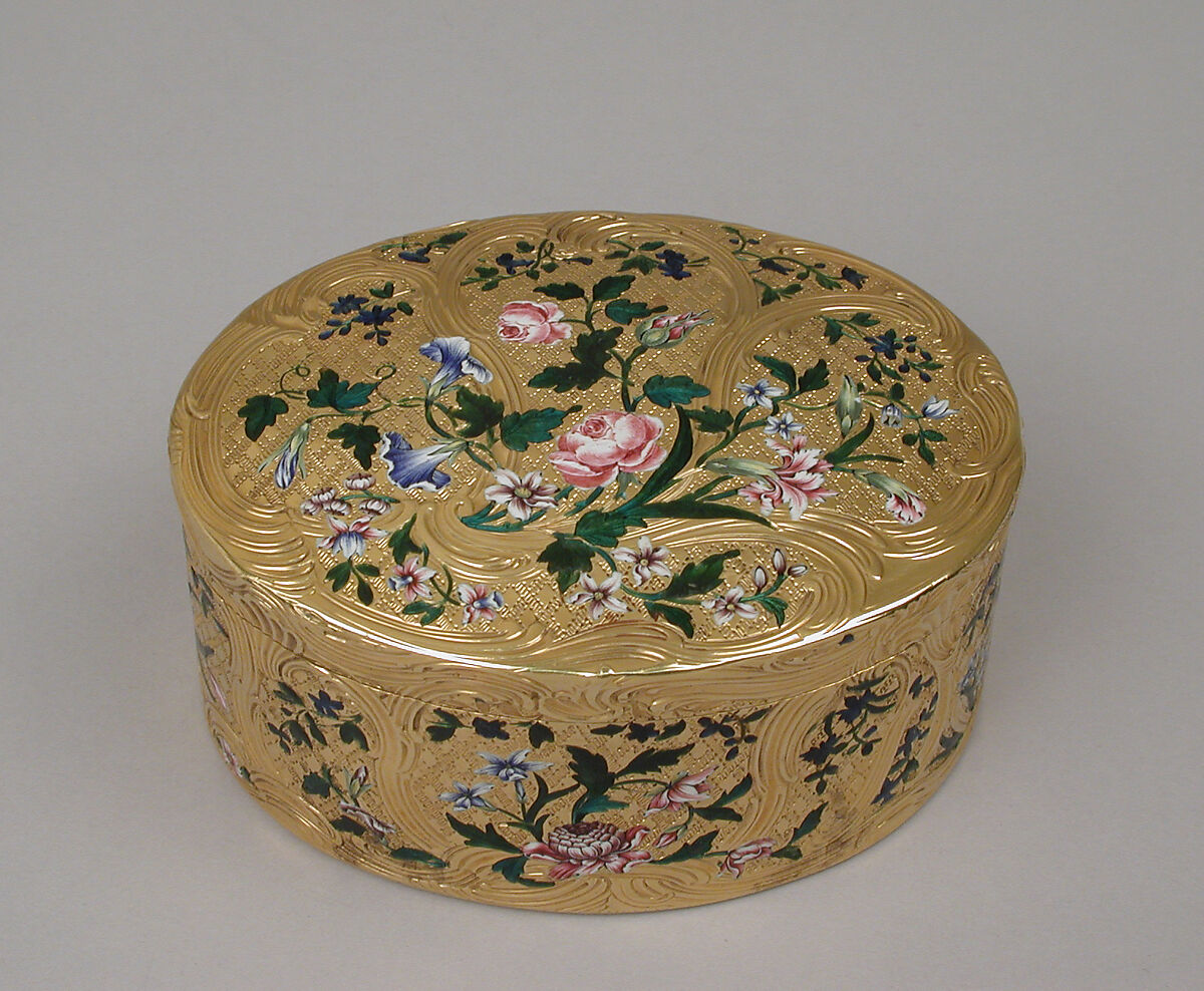 The box is one of at least six enameled in similar fashion and dated to between 1747/48 and 1756/57. This high-relief flower enameling has been attributed to Louis-François Aubert (master 1748, died 1755), who was described after his death as goldsmith and painter in enamels to the King. None of the boxes enameled in this manner bears his signature, and identification of his work has been deduced from contemporary descriptions of his style. As one box of the group was made after Aubert’s death and therefore must be considered the product of his workshop (which survived until the death of his widow in 1758), it seems prudent to withhold a definite attribution at the present time.