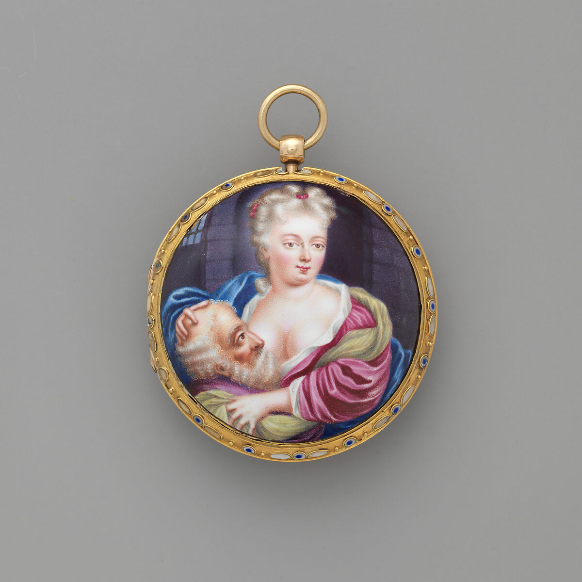 Jean-Pierre and Amy Huaud went into partnership in Geneva in 1682, but worked in Berlin from 1686 until 1700. When working together, they often signed their enamels in the way found on this watchcase: Les deux frères Huaut les jeunes. In 1700, they returned to Geneva, where they made watchcases for export. One of the Huauds' more popular designs, this enamel illustrates the story of Roman Charity as recounted in Book IX of De factis dictisque memorablilis by the Roman historian Valerius Maximus. As a representation of filial piety, it was well-known in seventeenth- and eighteenth-century Europe, and it was the subject of many paintings, including several by Peter Paul Rubens. The origin of the version used by the Huauds is not known, and the female figure of Pero, who breastfed her incarcerated father, Cimon, in order to save him from starvation, may in fact have recorded a living model.