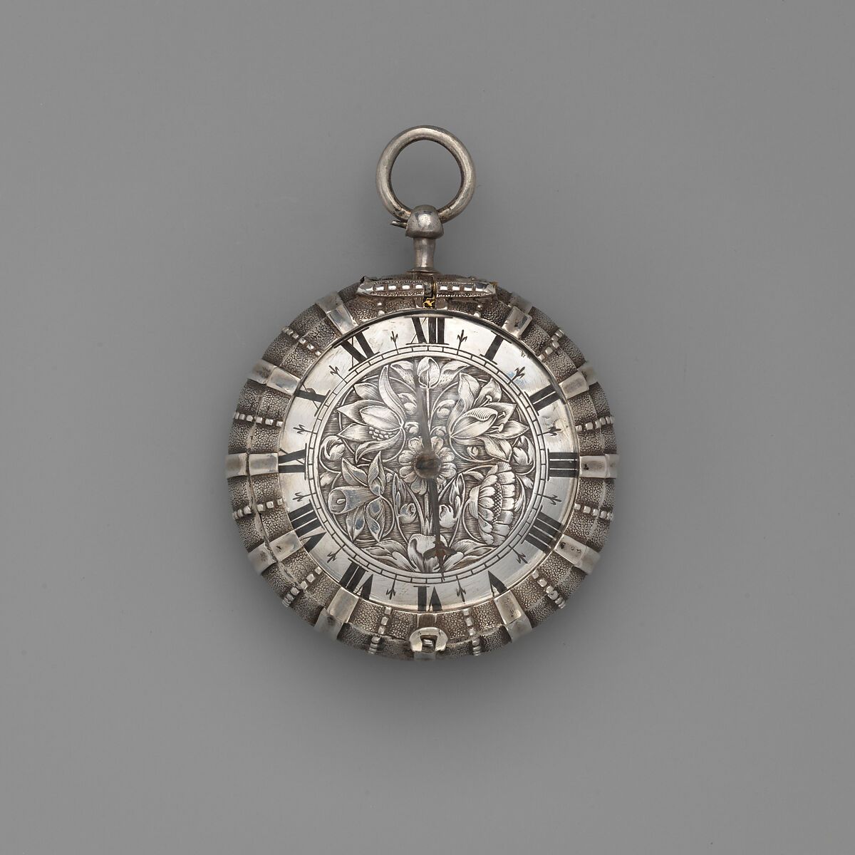 Naturalistic flowers in formal arrangements similar to those engraved on the dial of this watch were introduced by models in engravings of ornament during the middle years of the seventeenth century. The form of the case was inspired by the shell of a sea urchin.
