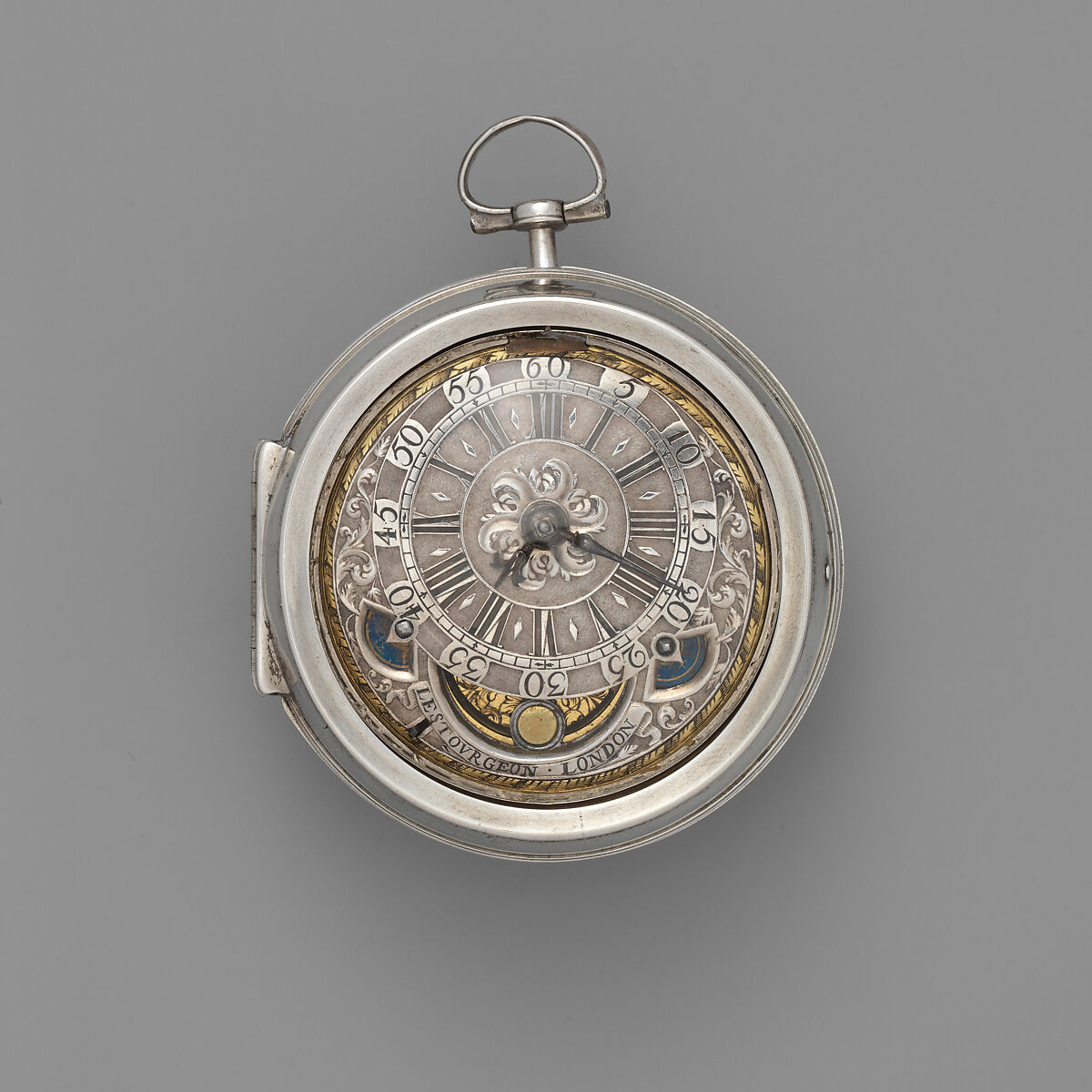 Pendulum watches attest to the success of the pendulum clock, although in reality these watches employ the standard balance for controlling the escapement. The movement is inverted in its case so that the balance is directly under the dial, and a bob attached to the balance shows through the crescent-shaped slot in the dial, where its oscillations resemble those of a true pendulum. Lestourgeon, a master clockmaker in Rouen in 1660, moved to London in 1681, no doubt as the result of the increasing intolerance of Protestants in France. He became a member of the London Clockmakers’ Company in 1698.